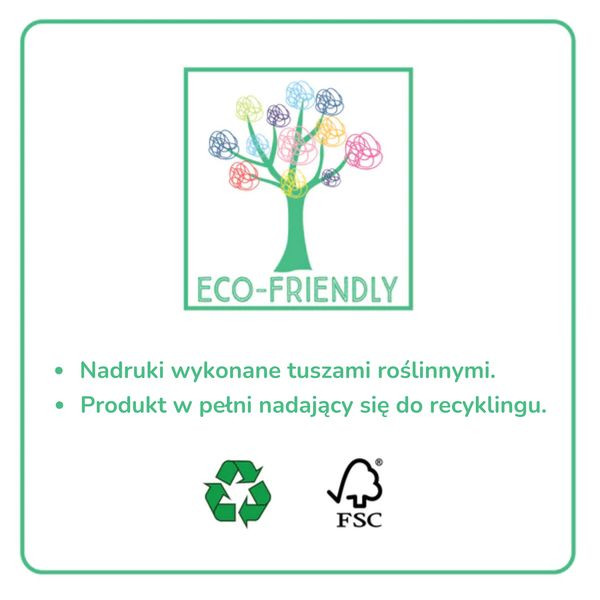 Produkt przyjazny dla środowiska. Nadruki wykonane tuszami roślinnymi. Produkt w pełni nadający się do recyklingu.