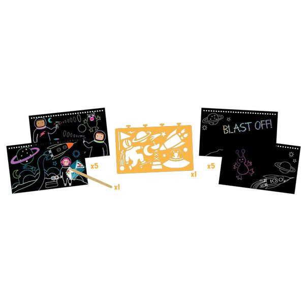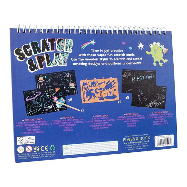 Zdrapywanka z rysikiem Kosmos to 10 kart zawierających wspaniałe ilustracje, czekające na odkrycie. Za pomocą drewnianego rysika można na nich rysować zdrapując warstwę czarnej farby i odkrywać kolorowy świat stacji kosmicznej, astronautów, kosmicznych zwierzaków, planet i wielu innych. Dołączony arkusz z szablonami można wyjąć, umieścić na dowolnej karcie i zdrapać kształt rakiety, kosmitów, latających spodków i nie tylko! Zdrapywanka Floss & Rock to świetny sposób na spędzenie wielu godzin kreatywnej zabawy, jak i trening doskonalenia koncentracji uwagi, dokładności i precyzji.