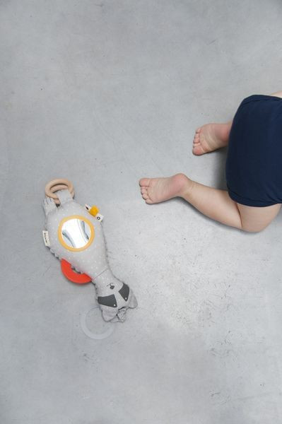 Zawieszka z lusterkiem na brzuszku to miękka i miła w dotyku zabawka, która pobudza wyobraźnie każdego maluszka. Pozwala odkrywać kolory, dźwięki, tekstury i przyglądać się sobie w mini lusterku.  Kontrastowe kolory stymulują zmysł wzrok, różnego rodzaju tekstury materiałów i wystające elementy zmysł dotyku, a intrygująca dźwiękiem grzechotka zmysł słuchu. Można ją przymocować do łóżeczka, nosidełka, wózka lub pałąka fotelika samochodowego.