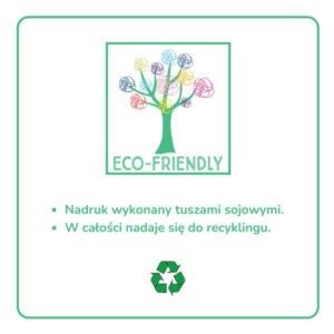 Produkt przyjazny dla środowiska. Nadruki zostały wykonane tuszami sojowymi. Produkt w pełni nadający się do recyklingu
