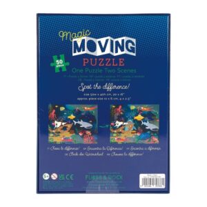 Daj się porwać podwodnej przygodzie dzięki niesamowitym, magicznym puzzlom. Ułóż układankę za pomocą 50 dużych, masywnych puzzli, a po jej zakończeniu baw się jeszcze lepiej, przesuwając ją z boku na bok i odnajduj różnice pomiędzy zmieniającymi się obrazami. Folia soczewkowa, którą pokryte są puzzle pozwala oglądać pływające rekiny, ławice ryb, nurkujących płetwonurków, unoszące się ośmiornice, zatopiony skarb piratów i nie tylko, poruszających się tuż przed Twoimi oczami. Odnajdywanie różnic pomiędzy zmieniającymi się obrazkami to doskonały trening dla dziecięcego umysłu.