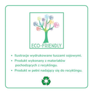 Produkt przyjazny dla środowiska. Produkt wykonany z materiałów pochodzących z recyklingu. Ilustracje zostały wydrukowane tuszami sojowymi. Produkt w pełni nadający się do recyklingu.