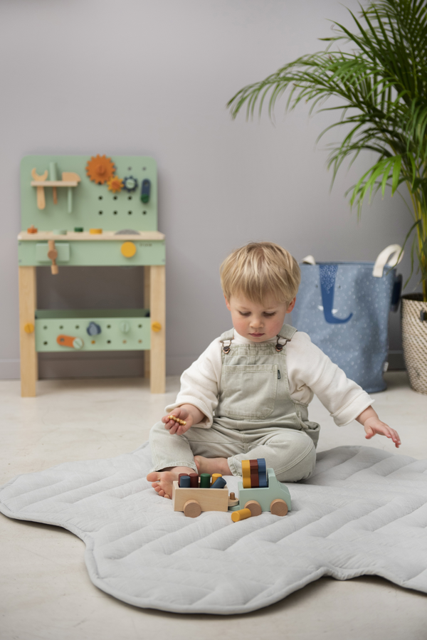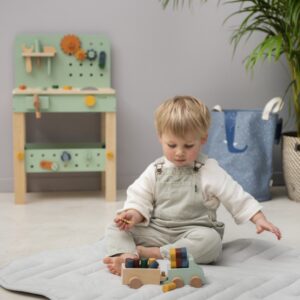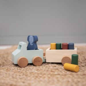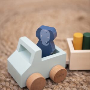 Słoń, Lew i Małpka w samochodzie oraz przyczepka załadowana ośmioma kolorowymi kłodami wyruszają w pełną przygód podróż. W trakcie zabawy można odłączyć przyczepę i wyjąć wszystkie kłody i zwierzaki, dzięki czemu dzieci mają dużo radości. Piękny produkt, który rozbudzi ich wyobraźnię. Produkt wykonany jest w 100% z drewna z certyfikatem FSC©. Farby na tym produkcie są na bazie wody, bezpieczne dla dzieci i nietoksyczne.